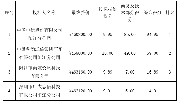 磋商結(jié)果:最終磋商小組一致推薦 中國電信股份有限公司陽江分公司 為成交單位,成交金額為人民幣 460200.00元,(大寫金額: 肆拾陸萬零貳佰元整 )。