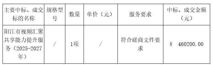 廣東業(yè)信采購招標(biāo)有限公司受 陽江市公安局 的委托,于2025年7月25日就 陽江市視頻匯聚共享能力提升服務(wù)(2025-2027年)項目(項目編號:YXCG-20250713)采用競爭性磋商方式進(jìn)行采購?,F(xiàn)就本次采購的成交結(jié)果公告如下: