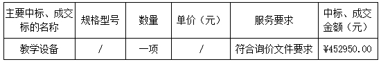 廣東業(yè)信招標(biāo)有限公司受陽江市共青湖學(xué)校的委托,于2024年8月29日就陽江市共青湖學(xué)校教學(xué)設(shè)備采購項(xiàng)目(項(xiàng)目編號:YXZB-20240822)進(jìn)行詢價(jià)采購,現(xiàn)將本次采購結(jié)果公告如下: