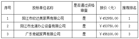 報(bào)價(jià)結(jié)果:最終詢價(jià)小組一致推薦 陽江市欣達(dá)美家具有限公司 為成交單位,成交金額為人民幣 452950.00 元(大寫金額: 肆拾伍萬貳仟玖佰伍拾元整 )。