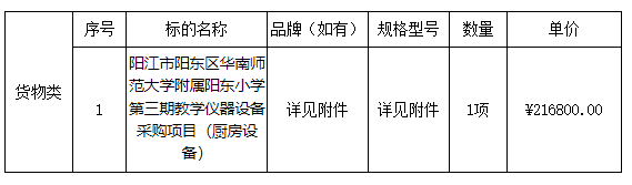 二、采購項目名稱:陽江市陽東區(qū)華南師范大學附屬陽東小學第三期教學儀器設備采購項目(廚房設備)