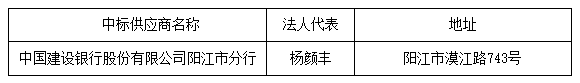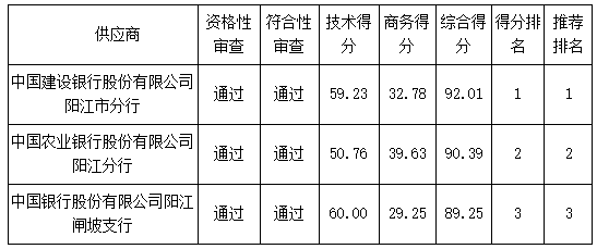 投標(biāo)結(jié)果:最終評(píng)標(biāo)委員會(huì)一致推薦 中國(guó)建設(shè)銀行股份有限公司陽(yáng)江市分行 為中標(biāo)單位。