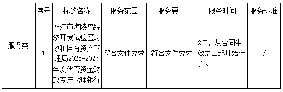 二、采購(gòu)項(xiàng)目名稱:陽(yáng)江市海陵島經(jīng)濟(jì)開發(fā)試驗(yàn)區(qū)財(cái)政和國(guó)有資產(chǎn)管理局2025-2027年度代管資金財(cái)政專戶代理銀行采購(gòu)項(xiàng)目