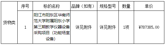 二、采購(gòu)項(xiàng)目名稱(chēng):陽(yáng)江市陽(yáng)東區(qū)華南師范大學(xué)附屬陽(yáng)東小學(xué)第三期教學(xué)儀器設(shè)備采購(gòu)項(xiàng)目(功能場(chǎng)室設(shè)備)