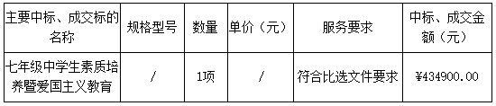 廣東業(yè)信采購(gòu)招標(biāo)有限公司受 陽(yáng)江市第二中學(xué) 的委托,于2024年8月21日就 陽(yáng)江市第二中學(xué)七年級(jí)中學(xué)生素質(zhì)培養(yǎng)暨愛國(guó)主義教育項(xiàng)目 (項(xiàng)目編號(hào):YXCG-20240815)采用公開比選方式進(jìn)行采購(gòu)?,F(xiàn)就本次采購(gòu)的成交結(jié)果公告如下: