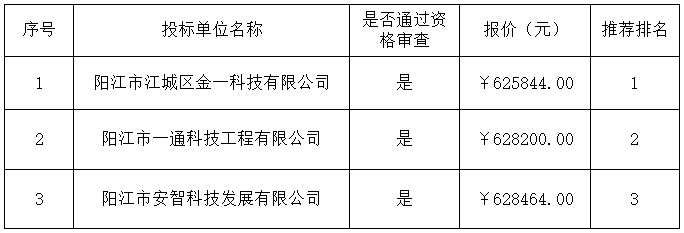 報(bào)價(jià)結(jié)果:最終詢價(jià)小組一致推薦陽江市江城區(qū)金一科技有限公司為成交單位,成交金額為人民幣625844.00元(大寫金額:陸拾貳萬伍仟捌佰肆拾肆元整)。