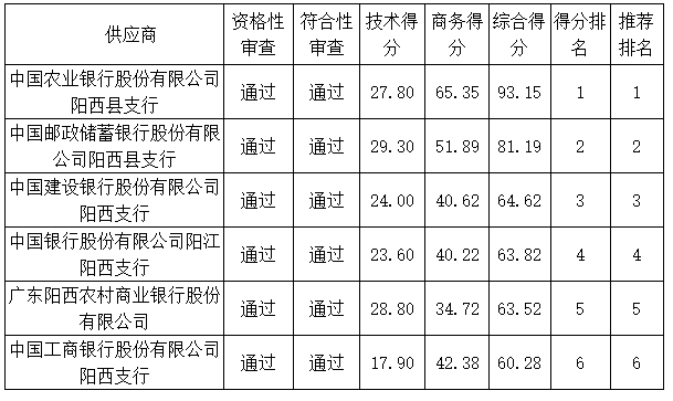 廣東業(yè)信招標有限公司受陽西縣財政局的委托,于2023年9月5日就2023年陽西縣統(tǒng)發(fā)工資代理銀行采購項目(項目編號:YXZB-20230812)采用公開招標方式進行采購。現(xiàn)就本次采購的中標結果公告如下: