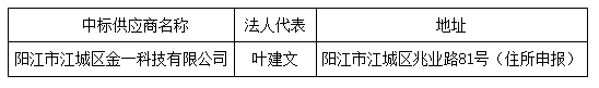 投標(biāo)結(jié)果:最終評標(biāo)委員會一致推薦 陽江市江城區(qū)金一科技有限公司 為中標(biāo)單位,中標(biāo)金額為人民幣 195000.00 元,(大寫金額: 壹拾玖萬伍仟元整 )。