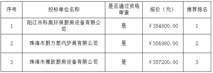報價結(jié)果:最終詢價小組一致推薦陽江市科奧環(huán)保廚房設備有限公司為成交單位,成交金額為人民幣354800.00元(大寫金額:叁拾伍萬肆仟捌佰元整)。