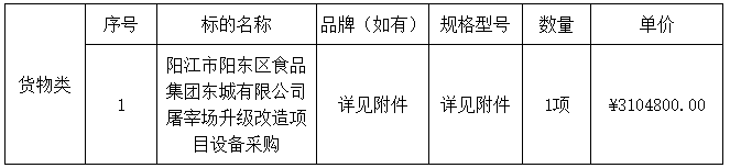 廣東業(yè)信采購招標有限公司受 陽江市陽東區(qū)食品集團東城有限公司 的委托,于2025年9月17日就 陽江市陽東區(qū)食品集團東城有限公司屠宰場升級改造項目設(shè)備采購(項目編號:YXCG-20250826)采用公開招標方式進行采購?,F(xiàn)就本次采購的中標結(jié)果公告如下: