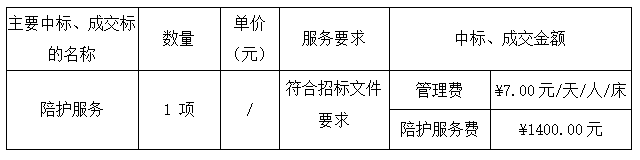 投標結果:最終評標委員會一致推薦 廣東聯(lián)贏人力資源服務有限公司 為預中標單位,中標的投標管理費為人民幣 7.00 元/天/人/床,陪護服務費為人民幣 1400.00 元。