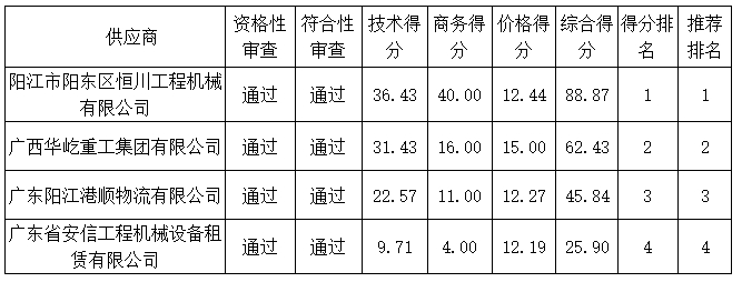 廣東業(yè)信招標(biāo)有限公司受陽江市陽江港廣泰隆碼頭有限公司的委托,于2024年4月19日就陽江市陽江港廣泰隆碼頭有限公司散裝貨物場地裝卸及船舶機械清艙勞務(wù)承包項目(項目編號:YXZB-20240327)采用公開招標(biāo)方式進行采購。現(xiàn)就本次采購的中標(biāo)結(jié)果公告如下: