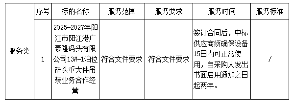 二、采購項(xiàng)目名稱:2025-2027年陽江市陽江港廣泰隆碼頭有限公司13#-1泊位碼頭重大件吊裝業(yè)務(wù)合作經(jīng)營項(xiàng)目(二次招標(biāo))