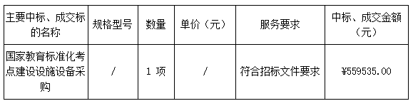 廣東業(yè)信采購招標有限公司受 陽春市春灣中學 的委托,于2024年8月14日就 陽春市春灣中學國家教育標準化考點建設(shè)設(shè)施設(shè)備采購項目(項目編號:YXCG-20240619)采用公開招標方式進行采購?,F(xiàn)就本次采購的中標結(jié)果公告如下: