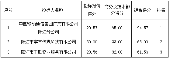 投標結(jié)果:最終評標委員會一致推薦 中國移動通信集團廣東有限公司陽江分公司 為中標單位,中標金額為人民幣 559535.00 元,(大寫金額: 伍拾伍萬玖仟伍佰叁拾伍元整 )。