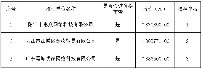 報價結(jié)果:最終詢價小組一致推薦陽江市惠眾網(wǎng)絡(luò)科技有限公司為成交單位,成交金額為人民幣379390.00元(大寫金額:叁拾柒萬玖仟叁佰玖拾元整)。