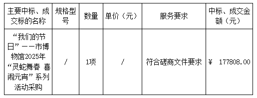 廣東業(yè)信采購招標(biāo)有限公司受 陽江市博物館 的委托,于2024年12月30日就 “我們的節(jié)日”——市博物館2025年“靈蛇舞春 喜鬧元宵”系列活動采購項(xiàng)目(項(xiàng)目編號:YXCG-20241218)采用競爭性磋商方式進(jìn)行采購?,F(xiàn)就本次采購的成交結(jié)果公告如下: