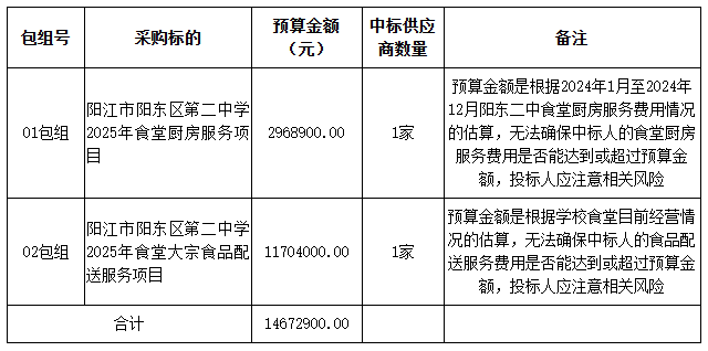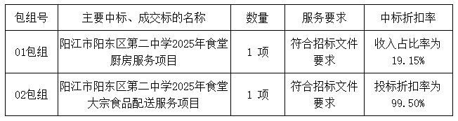 廣東業(yè)信采購招標(biāo)有限公司受 陽江市陽東區(qū)第二中學(xué) 的委托,于2025年7月22日就 陽江市陽東區(qū)第二中學(xué)2025年食堂廚房服務(wù)及大宗食品配送服務(wù)項(xiàng)目(項(xiàng)目編號(hào):YXCG-20250626)采用公開招標(biāo)方式進(jìn)行采購?,F(xiàn)就本次采購的中標(biāo)結(jié)果公告如下: