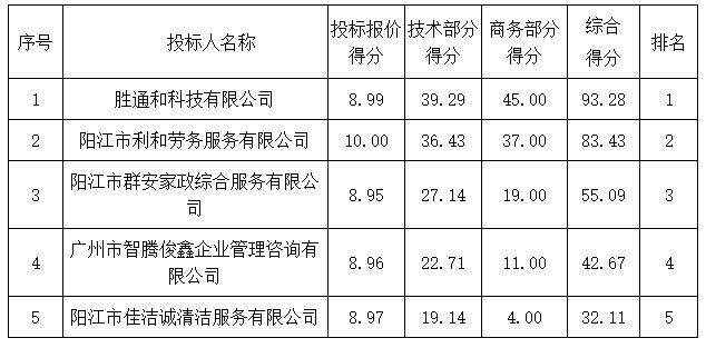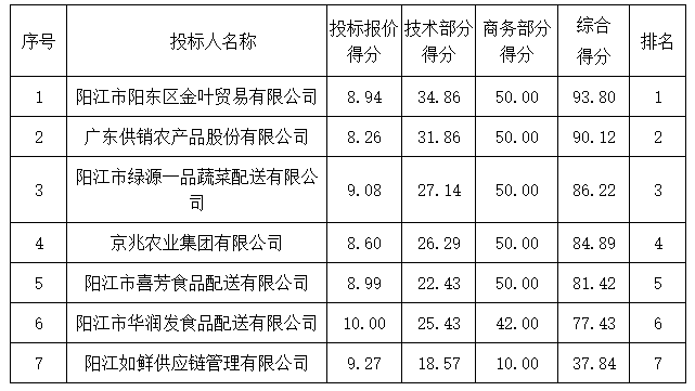 注:1.陽江市陽東區(qū)金葉貿(mào)易有限公司、陽江市綠源一品蔬菜配送有限公司、陽江市華潤發(fā)食品配送有限公司提供《中小微企業(yè)聲明函》,為小型企業(yè),價(jià)格優(yōu)惠10%。