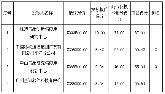 磋商結(jié)果:最終磋商小組一致推薦 珠澳氣象創(chuàng)新與應用研究中心 為成交單位,成交金額為人民幣 333500.00元,(大寫金額: 叁拾叁萬叁仟伍佰元整 )。
