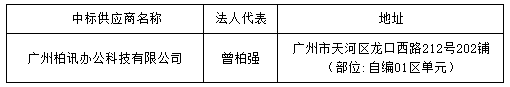 投標結果:最終評標委員會一致推薦 廣州柏訊辦公科技有限公司 為中標單位,中標金額為人民幣 991950.10 元,(大寫金額: 玖拾玖萬壹仟玖佰伍拾元壹角整 )。