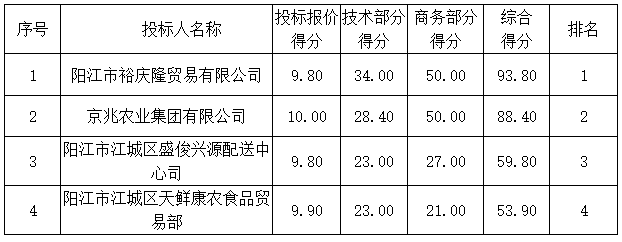 1.陽(yáng)江市裕慶隆貿(mào)易有限公司、京兆農(nóng)業(yè)集團(tuán)有限公司、陽(yáng)江市江城區(qū)盛俊興源配送中心司、陽(yáng)江市江城區(qū)天鮮康農(nóng)食品貿(mào)易部提供《中小微企業(yè)聲明函》,為微型企業(yè),價(jià)格優(yōu)惠10%。