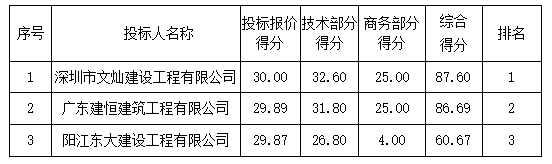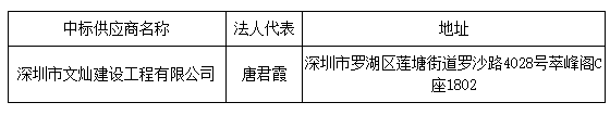 投標(biāo)結(jié)果:最終評標(biāo)委員會一致推薦 深圳市文燦建設(shè)工程有限公司 為預(yù)中標(biāo)單位,中標(biāo)金額為人民幣 401344.80 元,(大寫金額: 肆拾萬零壹仟叁佰肆拾肆元捌角整 ) 。
