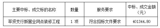 廣東業(yè)信采購招標(biāo)有限公司受 陽江農(nóng)村商業(yè)銀行股份有限公司 的委托,于2024年11月26日就 陽江農(nóng)村商業(yè)銀行股份有限公司萃賢支行新營業(yè)網(wǎng)點裝修工程項目(項目編號:YXCG-20241022)采用公開招標(biāo)方式進行采購?,F(xiàn)就本次采購的中標(biāo)結(jié)果公告如下: