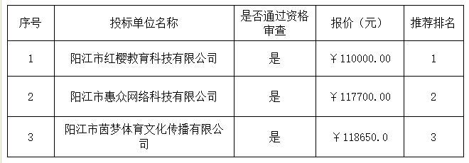 報價結(jié)果:最終詢價小組一致推薦陽江市紅櫻教育科技有限公司為成交單位,成交金額為人民幣110000.00元(大寫金額:壹拾壹萬元整)。