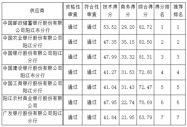投標結(jié)果:最終評標委員會一致推薦中國郵政儲蓄銀行股份有限公司陽江市分行為中標單位。