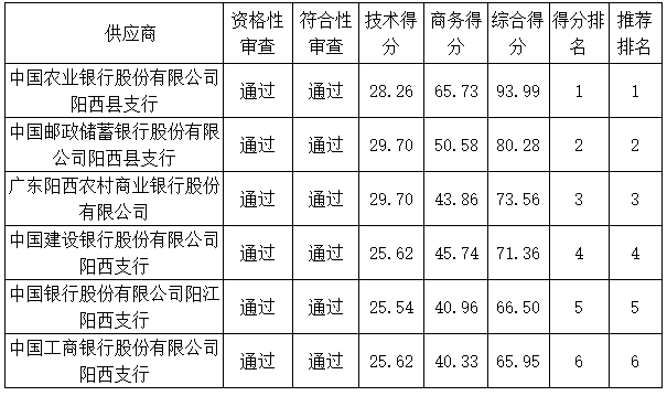 投標(biāo)結(jié)果:最終評(píng)標(biāo)委員會(huì)一致推薦中國農(nóng)業(yè)銀行股份有限公司陽西縣支行為中標(biāo)單位。