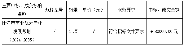 廣東業(yè)信采購招標(biāo)有限公司受 陽江市工業(yè)和信息化局 的委托,于2024年7月26日就 陽江市商業(yè)航天產(chǎn)業(yè)發(fā)展規(guī)劃(2024-2035)項(xiàng)目(項(xiàng)目編號:YXCG-20240620)采用公開招標(biāo)方式進(jìn)行采購?,F(xiàn)就本次采購的中標(biāo)結(jié)果公告如下:
