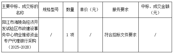 廣東業(yè)信采購招標有限公司受 陽江市海陵島經(jīng)濟開發(fā)試驗區(qū)市政建設(shè)事務(wù)中心 的委托,于2025年6月24日就 陽江市海陵島經(jīng)濟開發(fā)試驗區(qū)市政建設(shè)事務(wù)中心物業(yè)維修資金專戶代理銀行采購項目(2025-2028) (項目編號:YXCG-20250135)采用公開招標方式進行采購?,F(xiàn)就本次采購的中標結(jié)果公告如下: