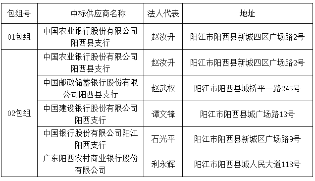 01包組:中國(guó)農(nóng)業(yè)銀行股份有限公司陽(yáng)西縣支行。