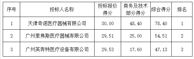 投標(biāo)結(jié)果:最終評標(biāo)委員會一致推薦天津奇諾醫(yī)療器械有限公司為中標(biāo)單位,中標(biāo)金額為人民幣227700.00元,(大寫金額:貳拾貳萬柒仟柒佰元整)。