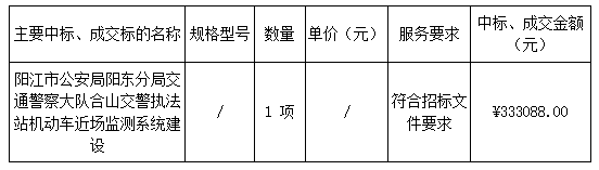 廣東業(yè)信采購招標(biāo)有限公司受 陽江市公安局陽東分局 的委托,于2024年11月4日就 陽江市公安局陽東分局交通警察大隊(duì)合山交警執(zhí)法站機(jī)動(dòng)車近場(chǎng)監(jiān)測(cè)系統(tǒng)建設(shè)項(xiàng)目(項(xiàng)目編號(hào):YXCG-20241008)采用公開招標(biāo)方式進(jìn)行采購?,F(xiàn)就本次采購的中標(biāo)結(jié)果公告如下: