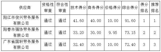 投標(biāo)結(jié)果:最終評標(biāo)委員會一致推薦陽江市俊興勞務(wù)服務(wù)有限公司為中標(biāo)單位,中標(biāo)金額為2397600.00元,綜合得分91.60 。