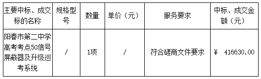 廣東業(yè)信采購(gòu)招標(biāo)有限公司受 陽(yáng)春市第二中學(xué) 的委托,于2025年9月8日就 陽(yáng)春市第二中學(xué)高考考點(diǎn)5G信號(hào)屏蔽器及升級(jí)巡考系統(tǒng)(項(xiàng)目編號(hào):YXCG-20250812)采用競(jìng)爭(zhēng)性磋商方式進(jìn)行采購(gòu)。現(xiàn)就本次采購(gòu)的成交結(jié)果公告如下: