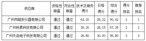 投標結(jié)果:最終評標委員會一致推薦 廣州市皓安儀器有限公司 為中標單位,中標金額為人民幣 839800.00 元,(大寫金額: 捌拾叁萬玖仟捌佰元整 )。