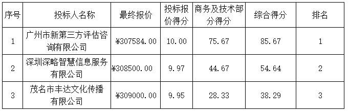 磋商結(jié)果:最終磋商小組一致推薦廣州市新第三方評估咨詢有限公司為成交單位,成交金額為人民幣307584.00元,(大寫金額:叁拾萬零柒仟伍佰捌拾肆元整)。