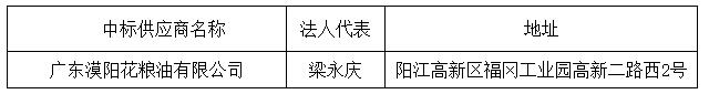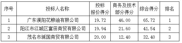 投標(biāo)結(jié)果:最終評標(biāo)委員會一致推薦廣東漠陽花糧油有限公司為預(yù)中標(biāo)單位,中標(biāo)金額為人民幣1800.00元/噸/年,(大寫金額:壹仟捌佰元整) ,中標(biāo)總金額為人民幣324000.00元,(大寫金額:叁拾貳萬肆仟元整)。