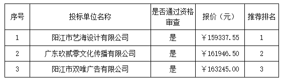 報(bào)價(jià)結(jié)果:最終詢價(jià)小組一致推薦 陽江市藝海設(shè)計(jì)有限公司 為成交單位,成交金額為人民幣 159337.55 元(大寫金額: 壹拾伍萬玖仟叁佰叁拾柒元伍角伍分 )。