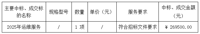 廣東業(yè)信采購招標(biāo)有限公司受 陽江市中西醫(yī)結(jié)合醫(yī)院 的委托,于2025年7月1日就 陽江市中西醫(yī)結(jié)合醫(yī)院2025年運(yùn)維服務(wù)采購項(xiàng)目 (項(xiàng)目編號:YXCG-20250131)采用公開招標(biāo)方式進(jìn)行采購。現(xiàn)就本次采購的中標(biāo)結(jié)果公告如下: