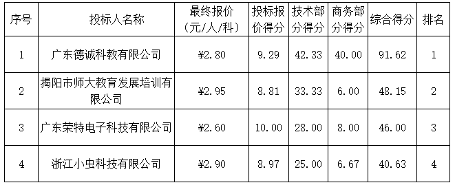 磋商結(jié)果:最終磋商小組一致推薦廣東德誠科教有限公司為成交單位,成交金額為人民幣2.80元/人/科,(大寫金額:貳元捌角整)。