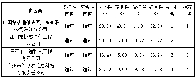 投標(biāo)結(jié)果:最終評(píng)標(biāo)委員會(huì)一致推薦中國(guó)移動(dòng)通信集團(tuán)廣東有限公司陽(yáng)江分公司為中標(biāo)單位,中標(biāo)金額為人民幣9501200.00元,(大寫金額:玖佰伍拾萬(wàn)零壹仟貳佰元整)。