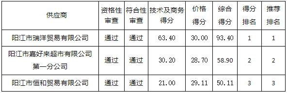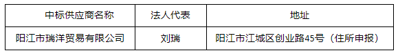 投標(biāo)結(jié)果:最終評(píng)標(biāo)委員會(huì)一致推薦 陽(yáng)江市瑞洋貿(mào)易有限公司 為中標(biāo)單位,中標(biāo)金額為人民幣 497950.00 元,(大寫(xiě)金額: 肆拾玖萬(wàn)柒仟玖佰伍拾元整 )。