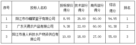 投標(biāo)結(jié)果:最終評(píng)標(biāo)委員會(huì)一致推薦 陽(yáng)江市巾幗菜籃子有限公司 為中標(biāo)單位,中標(biāo)折扣率為 99.50% 。