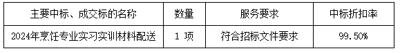 廣東業(yè)信采購(gòu)招標(biāo)有限公司受 陽(yáng)江技師學(xué)院 的委托,于2024年8月16日就 陽(yáng)江技師學(xué)院2024年烹飪專業(yè)實(shí)習(xí)實(shí)訓(xùn)材料配送采購(gòu)項(xiàng)目 (項(xiàng)目編號(hào):YXCG-20240601)采用公開招標(biāo)方式進(jìn)行采購(gòu)。現(xiàn)就本次采購(gòu)的中標(biāo)結(jié)果公告如下:
