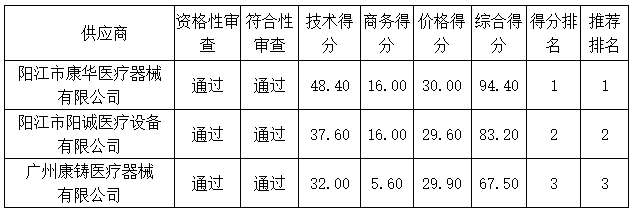 投標(biāo)結(jié)果:最終評(píng)標(biāo)委員會(huì)一致推薦陽(yáng)江市康華醫(yī)療器械有限公司為中標(biāo)單位,中標(biāo)金額為人民幣598000.00元,(大寫金額:伍拾玖萬(wàn)捌仟元整)。