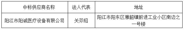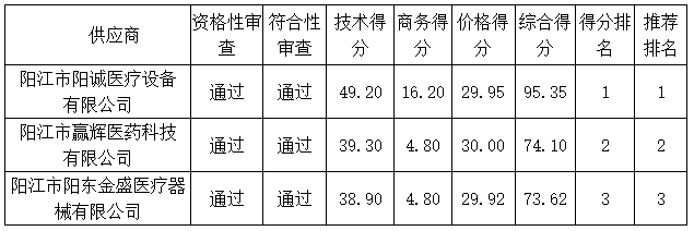 投標結(jié)果:最終評標委員會一致推薦陽江市陽誠醫(yī)療設(shè)備有限公司為中標單位,中標金額為人民幣297500.00元,(大寫金額:貳拾玖萬柒仟伍佰元整)。